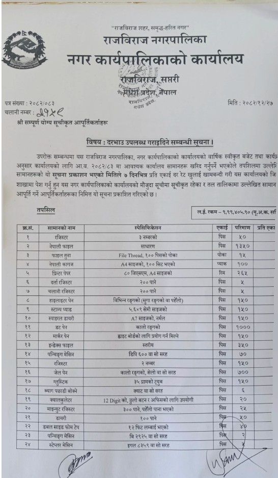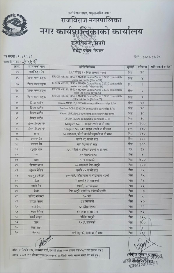 कम्प्यूटर प्रिन्टर लगायत कार्यालय सरसामानहरुको दररेट पेश गर्ने सम्बन्धमा ।