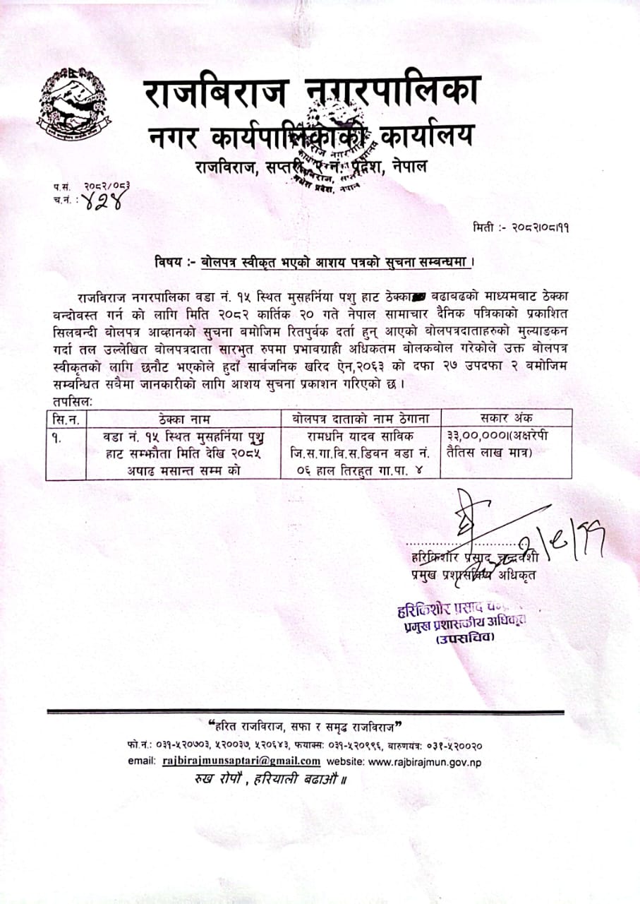 बोलपत्र स्वीकृत गर्ने आश्यको सूचना ।