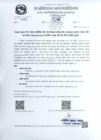 रोजगार सृजना गर्ने, रोजगार खोजीमा रहने, रोजगार सीप तयार गर्ने, रोजगारमा सहयोग गर्ने का लागि श्रम संसार (Shramsansar) प्रणलीमा आबद्ध भई सेवा लिने सम्बन्धी सुचना ।