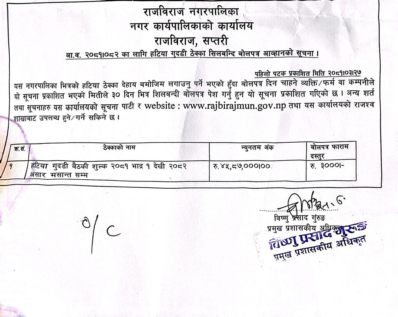 आ.व. २०८१/०८२ का लागि हटिया गुदडी ठेक्का सिलबन्दी बोलपत्र आहवानको सूचना ।