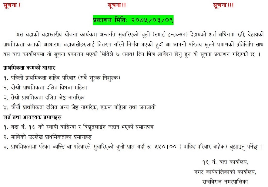» रा.न.पा. वडा नं. १६ को वासिन्दाहरुको लागि सुधारिएको चुलो सम्बन्धि सूचना