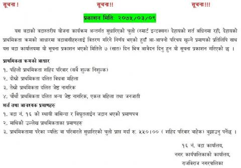 रा.न.पा. वडा नं. १६ को वासिन्दाहरुको लागि सुधारिएको चुलो सम्बन्धि सूचना