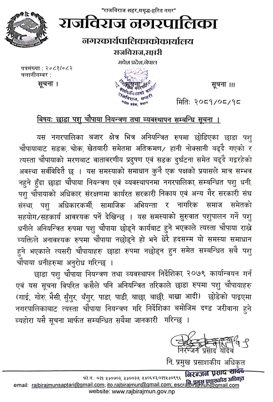 » छाडा पशु चौपाया नियन्त्रण तथा व्यवस्थापन सम्बन्धि सूचना ।