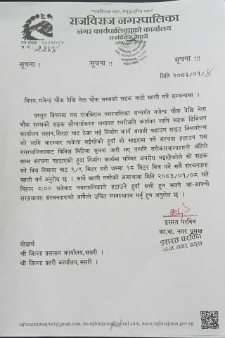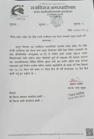 मलेठ शहिद गेट देखि रुपनी राजविराज बस स्टेन्ड सम्मको सडक खाली गर्ने सम्बन्धमा ।