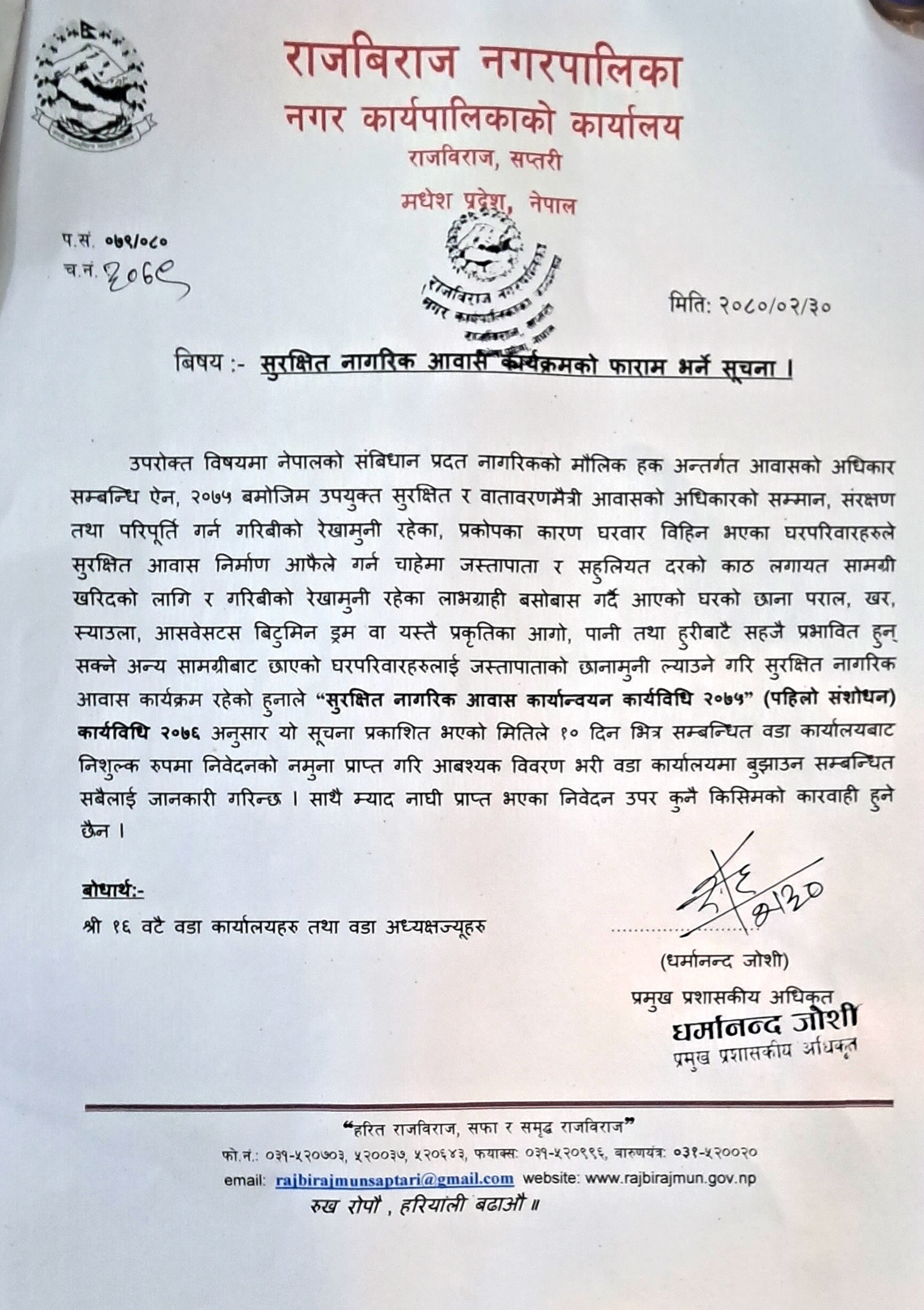 सुरक्षित नागरिक आवास कार्यक्रमको फाराम भर्ने सूचना ।